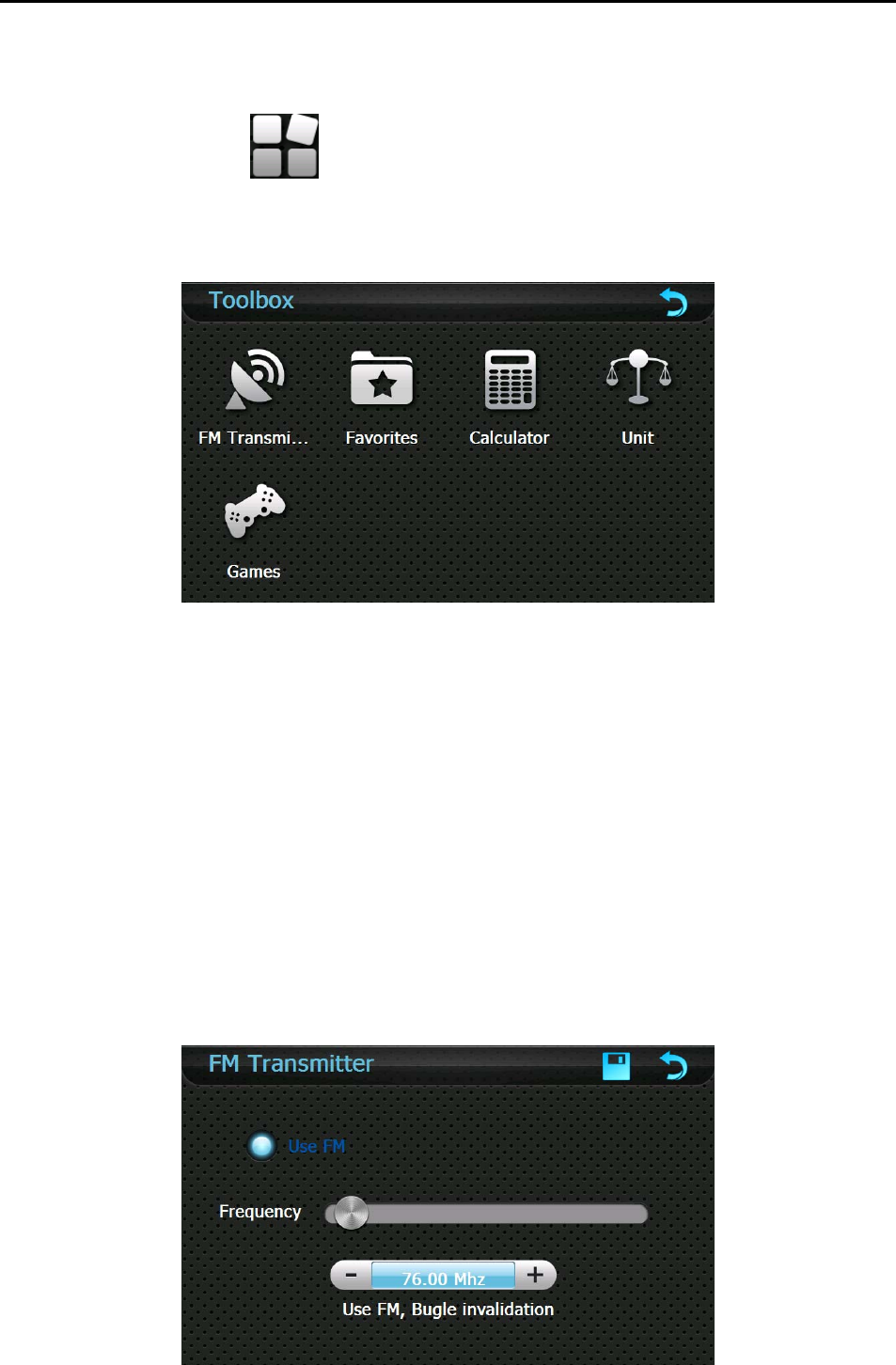 Tap the icon in the Toolbox interface to enter FM Transmitter interface shown as