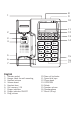 8 9 1 10 11 12 2 13 3 4 14 5 15 16 17 6 7 English 1. . 3. 4. 5. 6. 7. 8. 9. Vibrator socket Hanger Hook for wall mounting Handset volume Volume boost Handset tone Call memory / OK Ringer indicator Ringer indicator ON/OFF Ring volume 10. New call indicator 11. Speed dial keys 1 . Phone book 13. UP/DOWN 14. Delete 15. Speaker volume 16. Speakerphone 17.