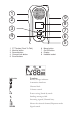 1 2 9 8 7 6 5 3 4 1 2 3 4 5 PTT button (Push To Talk) Monitor button Search button Channel lock button Scroll buttons Indicator 6 7 8 9 Menu button On/Off button Display Headset socket Function Battery charge indicator. Automatic shutdown. Channel lock. Volume control. PS Power saving/Stand-by mode. Sending messages/talk. Incoming signals/Channel busy. Shows the selected channel/Repeater mode. SCAN Signal search.