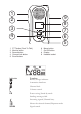 1 2 9 8 7 6 5 3 4 1 2 3 4 5 PTT button (Push To Talk) Monitor button Search button Channel lock button Scroll buttons Indicator 6 7 8 9 Menu button On/Off button Display Headset socket Function Battery charge indicator. Automatic shutdown. Channel lock. Volume control. PS Power saving/Stand-by mode. Sending messages/talk. Incoming signals/Channel busy. Shows the selected channel/Repeater mode. SCAN Signal search.