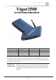 Vigor2500 Series Quick Start Guide Aim of this chapter Delivery check Quickly connect your router to the Internet Check your router package for the following items : The Router 1 printed Quick Start Guide with warranty/ registration card 1 CD includes detailed User Manual in electronic form, released firmware and utilities 1 AC/DC power supply adapter (black) 1 Ethernet LAN cable (blue) for connection to a computer or hub 1 ADSL line cable (RJ-11 or RJ-45, black) 1 external antenna for Vigor2500We/Wt Id