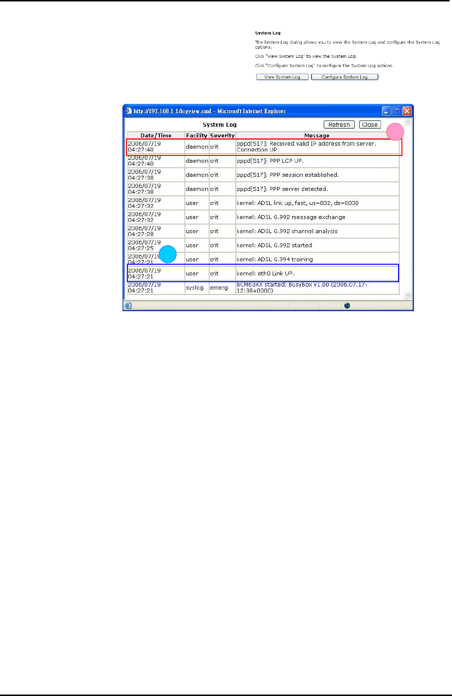 Th log ree system cord on the router will be displayed on a screen shown as below.