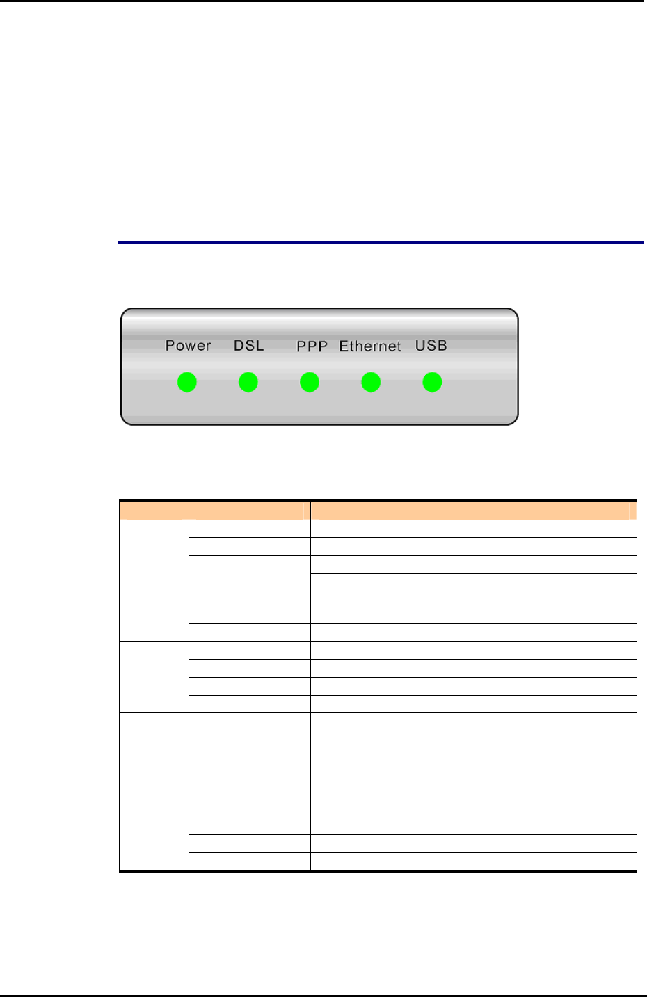 The ADSL Router is equipped with several LEDs on the front panel as described in