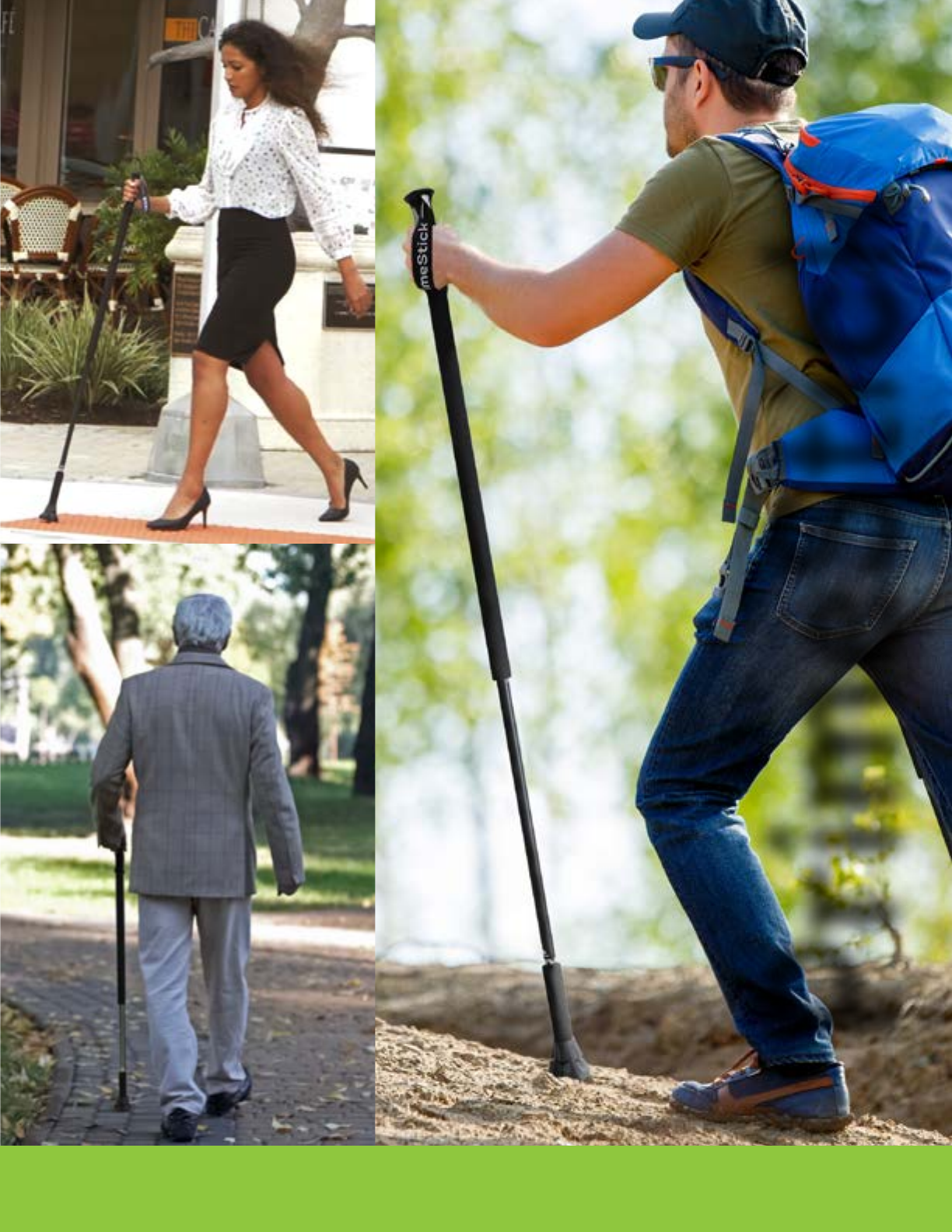 z Handgrip is channels away water like a race car tire Adjustable. Fits anyone! Trekking pole: up to 56 inches all-terrain tread Lightweight. Walking stick: whatever is comfortable! z Waterproof, Cane height: 33.8 inches covered with sweat-absorbing EVA foam WORLD’S FIRST URBAN CANE Mobility & traction.