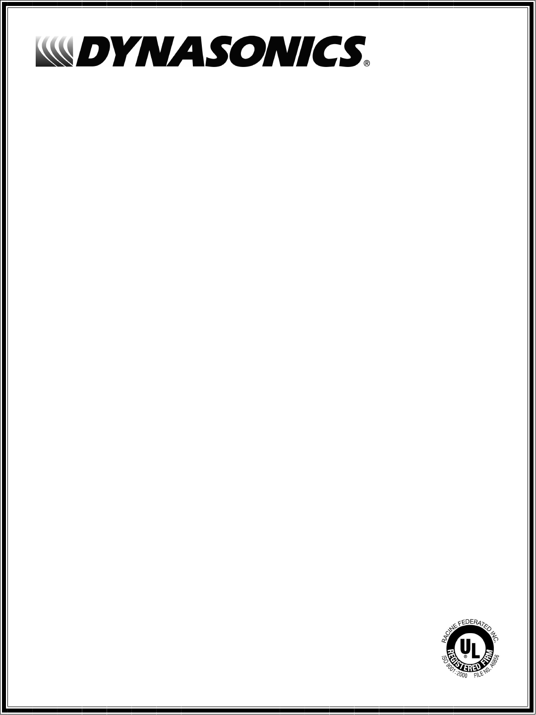 8635 WASHINGTON AVENUE RACINE, WI 53406 TOLL-FREE IN NORTH AMERICA TEL: (800) 535-3569 FAX: (800) 732-8354 TEL: (262) 639-6770 FAX: (262) 639-2267 URL: www.dynasonics.com DYNASONICS is a registered trademark of Racine Federated Inc. Ultem is a registered trademark of General Electric Co. Vespel is a registered trademark of E.I. DuPont de Nemours and Company. National Electric Code is a registered trademark of NFPA. UL is a registered trademark of Underwriters Laboratories. © 2008 Racine Federated Inc.