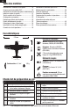 FR Guide de dépannage (Suite) Problème La DEL du récepteur clignote rapidement et l’avion ne répond pas à l’émetteur (après l’affectation) Cause Possible Solution Moins de 5 secondes se sont écoulées entre En laissant l’émetteur sous tension, la mise sous tension de l’émetteur et la déconnectez la batterie de vol puis connexion de la batterie sur l’avion reconnectez-la Aéronef affecté à une mémoire de modèle différente (radios ModelMatch uniquement) Sélectionnez la bonne mémoire de modèle sur l’émetteu
