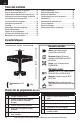 FR Table des matières Affectation de l’émetteur au récepteur ................31 Coupure par tension faible (LVC) .........................31 Programmation alternative des modes de vol ......32 Armement du contrôleur/récepteur, installation de la batterie et centre de gravité........................33 Test de contrôle de la direction ...........................34 Centrage des commandes .................................35 Trimming ............................................................