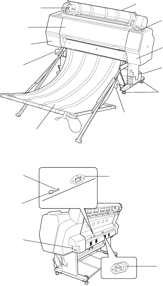 These illustrations show the parts of the Epson Stylus Pro WT7900.