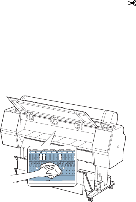 in blue. If necessary, dampen the cloth, clean the inside of the printer,