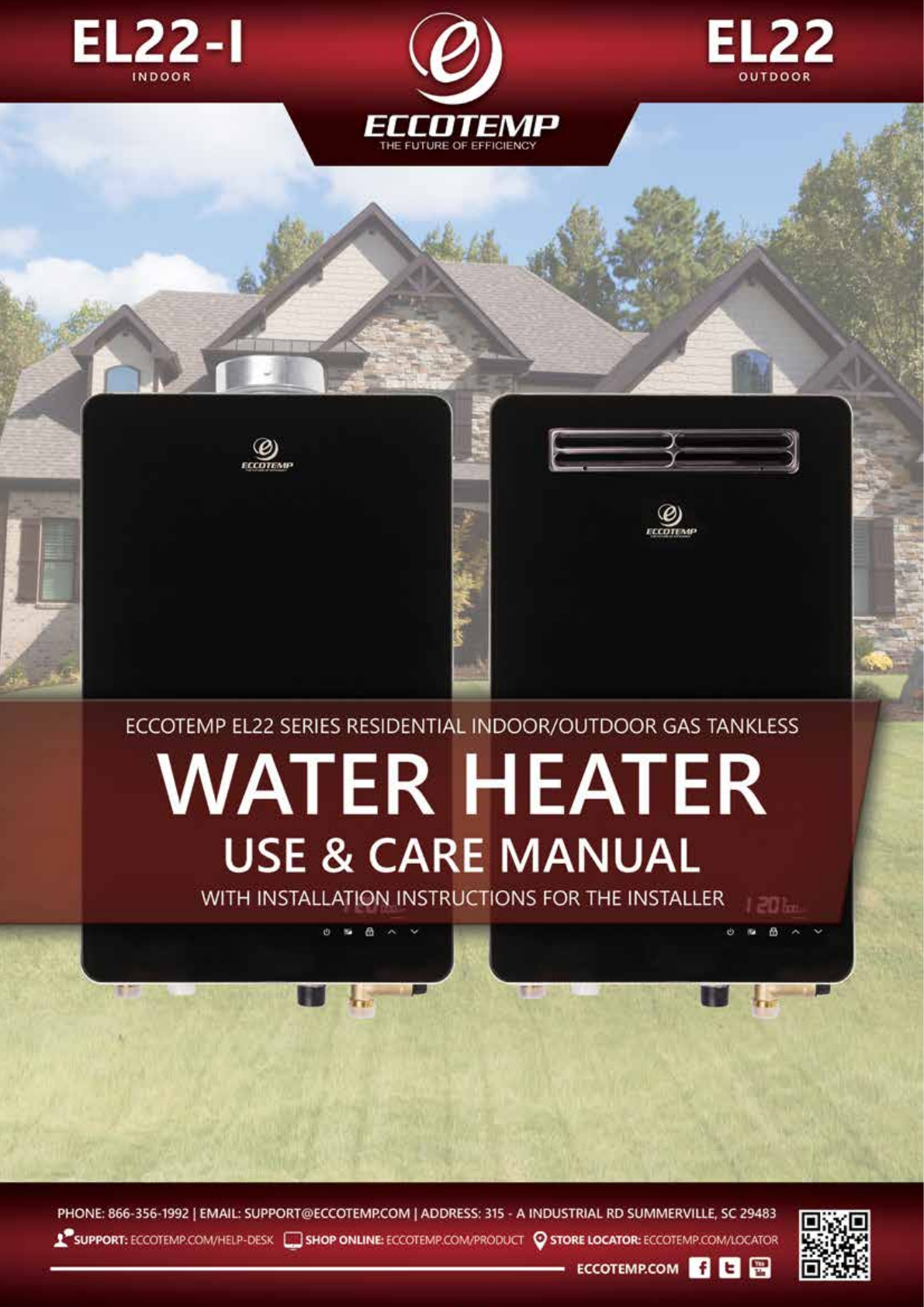 Phone: 866-356-1992 | Email: Support@eccotemp.com | Address: 315 - A Industrial RD Summerville, SC 29483 English EL22-I Installing the EL22-I water heater PLEASE NOTE: EL22 IS FOR OUTDOOR PERMANENT INSTALLATIONS ONLY AND EL22-I IS FOR INDOOR PERMANENT INSTALLATIONS ONLY. THIS MANUAL AND ALL ECCOTEMP CONTENT IS SUBJECT TO CHANGE WITHOUT NOTICE. PLEASE VISIT WWW.ECCOTEMP.COM/SUPPORT FOR MORE INFORMATION. Support: Eccotemp.com/help-desk Shop Online: Eccotemp.com/products Store Locator: Eccotemp.