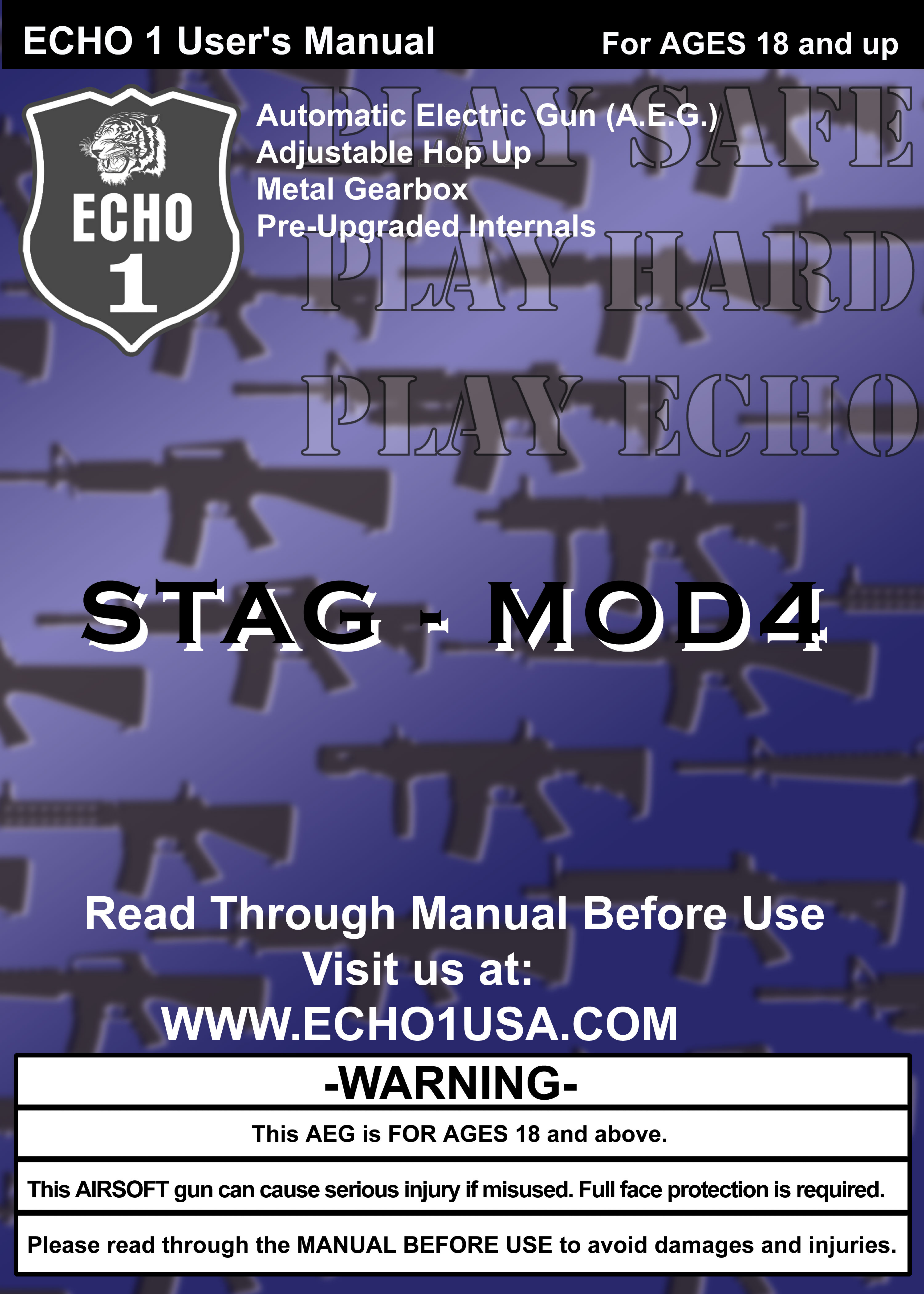 ECHO 1 User's Manual For AGES 18 and up -Warning This AEG is FOR AGES 18 and above. This AIR SOFT gun can cause serious injury if misused. Full face protection is required. Please read through the MANUAL BEFORE USE to avoid damages and injuries.