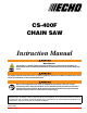 WARRANTY STATEMENTS CS-400F PURCHASED REPAIR PARTS, SHORT BLOCKS AND ACCESSORIES GD\ UHVLGHQWLDO RU QRQ LQFRPH SURGXFLQJ ZDUUDQW\ GD\ FRPPHUFLDO LQVWLWXWLRQDO DJULFXOWXUDO LQGXVWULDO LQFRPH SURGXFLQJ RU UHQWDO DSSOLFDWLRQ ZDUUDQW\ ATTENTION TWO-STROKE ENGINE POWER PRODUCT OWNERS This ECHO two-stroke engine power product is a quality-engineered unit which has been manufactured to exact tolerances to provide superior performance.