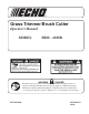 GRASS TRIMMER/BRUSH CUTTER OPERATOR'S MANUAL NYLON LINE REPLACEMENT Level 1. Parts Required: ECHO 0.095 in. Nylon Trimmer Line 6 m (20 ft.) long. 1. Shut engine off. Lay unit on the ground with head assembly up. B 2. Hold drum (A) and firmly turn spool (B) CW (clockwise) until it disengages from the inner drive. Pull spool from drum. DO NOT push in on spool when turning. A A B 3. Use one piece of new nylon line (C) 6 m (20 ft.) long and thread through the molded loop (D) on the spool.