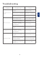 Troubleshooting The appliance does not turn on Weak suction power Abnormal motor sounds Battery won’t charge Possible cause Solution No power Charge the battery Auto protection for overheating Restart after cooling down The suction mouth is blocked Check and remove blockages Dustbin and filters are full Clean the dustbin and filters The pre-filter is not installed Install the pre-filter The appliance is blocked (i.e.