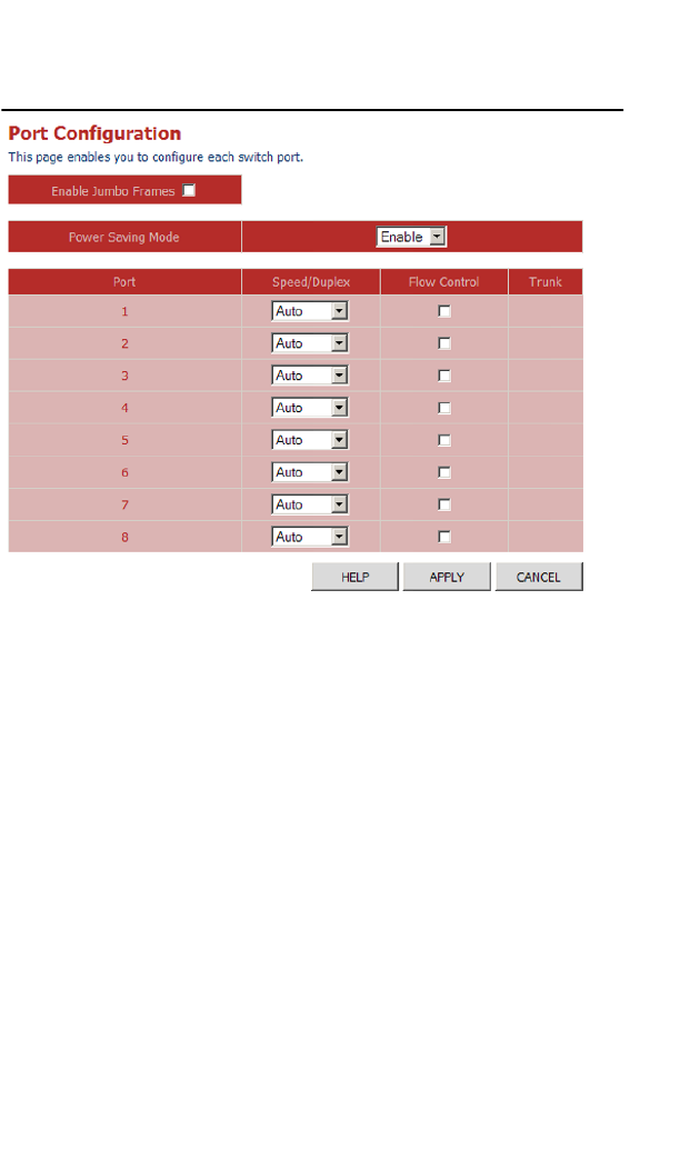 Web – Click PORTS, Settings. Enable or disable jumbo frames, select the required