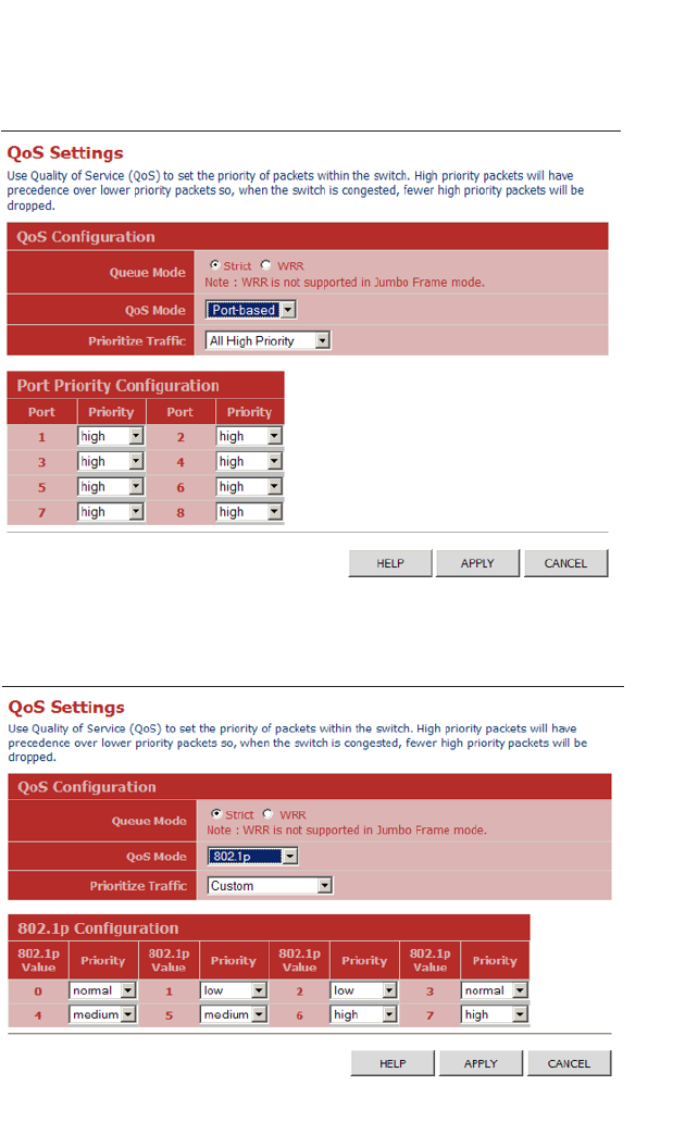 Web – Click QOS, Settings. In QoS Mode, select Port-based, 802.1p, or DSCP to