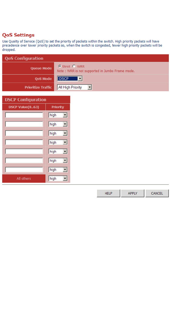When the QoS Mode is set to DSCP, the DSCP Configuration table is displayed as