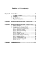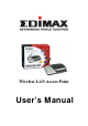 Ta ble of Co nte nts Chapter 1 Introduction.........................................................1 1.1 Pac kage Contents.........................................1 1.2 Features........................................................2 1.3 Specificati ons................................................2 1.4 Physical Description......................................3 Chapter 2 W ireless L AN Access Point Connection..........5 Chapter 3 W ireless L AN Access Point Configuration......6 3.1 Getti ng Started....