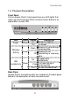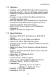 Introduction 1.2 F eat ur es y Complies with the IEEE 802.11g/b 2.4GHz specificati on. y High data r ate 54, 11, 5.5, 2 and 1M bps network s peed. y Seamlessl y integrate wireless and wired Ethernet LAN networ ks. y Provi des an i nternal 5-Port Fast Ethernet Switc h for wired Ethernet connection. y Auto rate fallbac k in c ase of obs tacles or interferences. y Provi de 64/128-bit WEP Data Encr yption function to protect the wireless data transmissions.