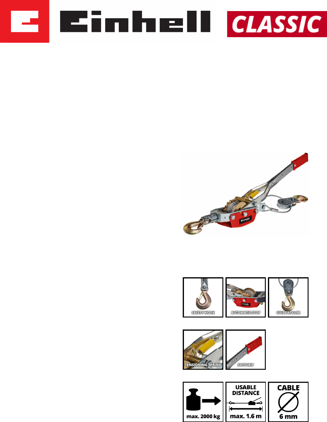 The Einhell TC-LW 2000 hand lever winch is suitable for pulling and tensioning loads with a maximum tensile load of 2,000 kg and a maximum useable