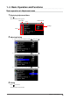 1- 4. Basic Operation and Functions Basic operation of Adjustment menu 1 Displaying Adjustment Menu Press . The adjustment menu appears. Menu title Item Current mode Settings Menu 2 3 Adjusting/Setting 1. Choose a menu to adjust/set with , and press . 2. Choose an item to adjust/set with , and press . 3. Adjust/set the selected item with , and press . Exiting Press a few times. The adjustment menu finishes.