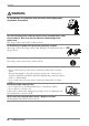 English WARNING To avoid danger of suffocation, keep the plastic packing bags away from babies and children. Use the enclosed power cord and connect to the standard power outlet of your country. Be sure to remain within the rated voltage of the power cord. Not doing so may cause in fire or electric shock. To disconnect the power cord, grasp the plug firmly and pull. Never tug on the cord, doing so may cause damage and could result in fire or electric shock.