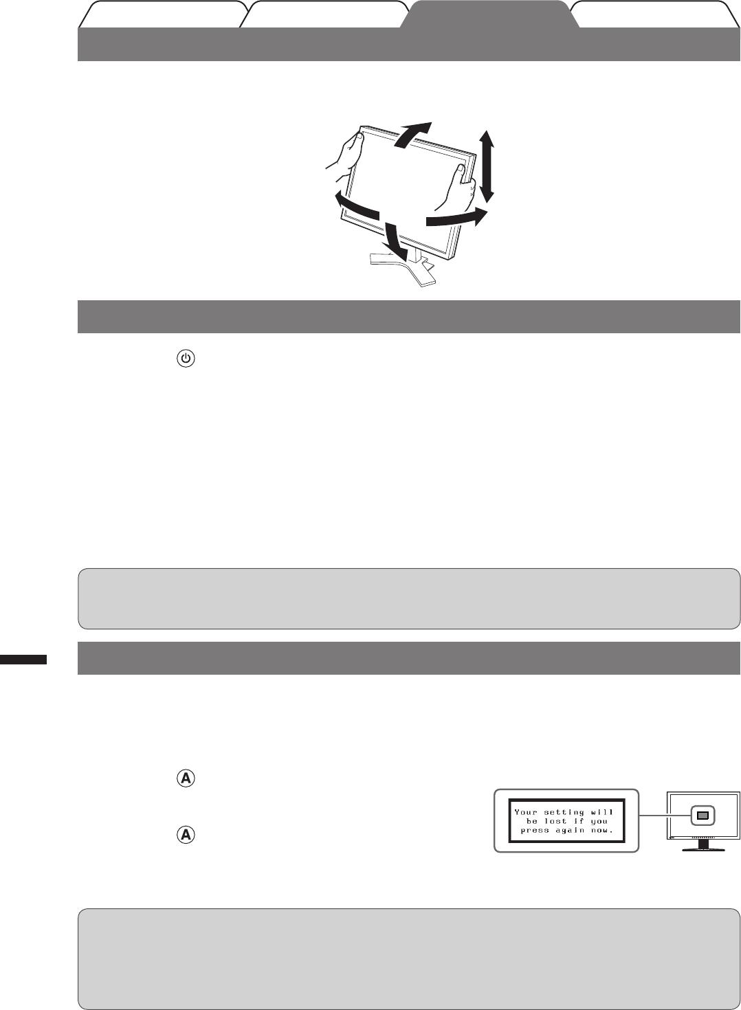 Håll i vänster och höger kant av skärmen med båda händerna och justera skärmens höjd, lutning och vridning till bästa