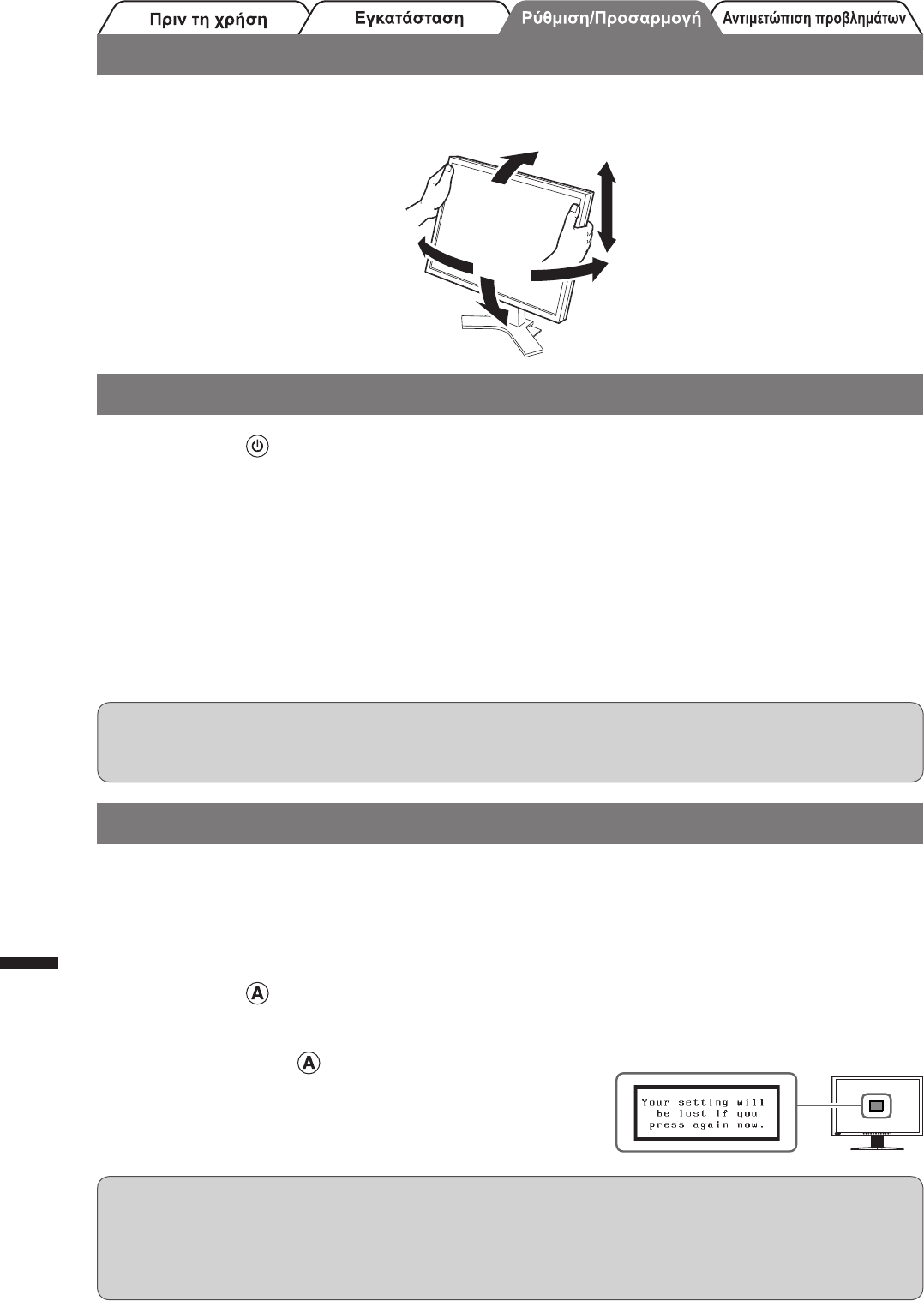 Κρατήστε την αριστερή και τη δεξιά πλευρά της οθόνης και με τα δύο χέρια σας και ρυθμίστε το ύψος, την κλίση και