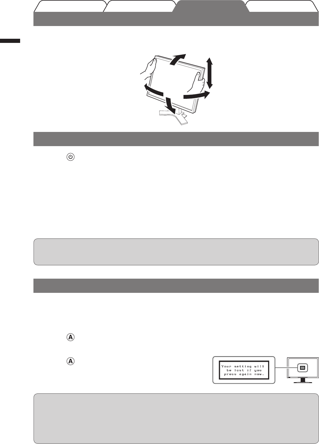 Hold left and right edge of the monitor with both hands, and adjust the screen height, tilt and swivel of the screen to the