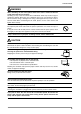 PRECAUTIONS WARNING Place the unit at the strong and stable place. A unit placed on an inadequate surface may fall and result in injury or equipment damage. If the unit falls, disconnect the power immediately and ask your dealer for advice. Do not continue using a damaged unit. Using a damaged unit may result in fire or electric shock. OK Set the unit in an appropriate location. Not doing so may result in fire, electric shock, or equipment damage. • Do not place outdoors.