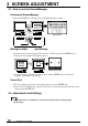 2 SCREEN ADJUSTMENT 2-1. How to use the ScreenManager Entering the ScreenManager Press the ENTER key to display the ScreenManager Main menu. Main menu Making the Adjustments and Settings 1) Select the desired icon using the Arrow keys, and then press the ENTER key to display the each adjustment/setting menu. Adjustment menu 2) Use the Control pad (the four Arrow keys and the ENTER key) to make the required adjustments and settings.