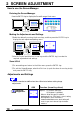 2 SCREEN ADJUSTMENT How to use the ScreenManager Entering the ScreenManager Press the ENTER key to display the ScreenManager Main menu. Main menu Making the Adjustments and Settings 1) Select the desired icon using the Arrow keys, and then press the ENTER key to display the each adjustment/setting menu. Adjustment menu 2) Use the Control pad (the four Arrow keys and the ENTER key) to make the required adjustments and settings.