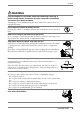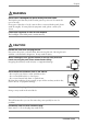 English WARNING Do not touch a damaged LCD panel directly with bare hands. The liquid crystal that may leak from the panel is poisonous if it enters the eyes or mouth. If any part of the skin or body comes in direct contact with the panel, please wash thoroughly. If some physical symptoms result, please consult your doctor. Follow local regulation or laws for safe disposal. The backlight of the LCD panel contains mercury. CAUTION Handle with care when carrying the unit.