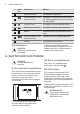 www.electrolux.com 3.2 Vadības paneļa izkārtojums 1 2 3 8 00:02 9 8 7 Simbols Funkcija 1 2 3 - 4 5 6 7 8 9 - 6 5 4 Komentāri IESLĒGT/IZSLĒGT Lai ieslēgtu vai izslēgtu plīts virsmu. Zonas pozīcija Lai norādītu zonas pozīciju. Lai aktivizētu zonu, pieskarieties simbolam. Gatavošanas zona ir aktivizēta Lai mainītu sildīšanas pakāpi vai iestatītu papildu funkcijas, pieskarieties simbolam. Izvēlne Lai izvēlētos papildu funkcijas un iestatīju‐ mus.