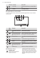 LATVIEŠU 9 4. IZSTRĀDĀJUMA APRAKSTS 4.1 Plīts virsmas shēma 1 1 Indukcijas gatavošanas zona 2 Vadības panelis 3 Elastīga indukcijas gatavošanas zona 1 3 2 4.2 Vadības paneļa izkārtojums 1 2 3 8 00:02 9 8 7 Simbols Funkcija 1 2 3 - 4 5 6 7 - 6 5 4 Komentāri IESLĒGT/ IZSLĒGT Lai aktivizētu vai deaktivizētu plīts virsmu. Zonas pozīcija Lai norādītu zonas pozīciju. Lai aktivizētu zonu, pieskarieties simbolam.