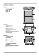 Laitteen kuvaus Liesi 1 2 3 4 5 1 2 Keraaminen keittotaso Ohjauspaneeli Uuni, ylä Uuni, ala Jalusta 3 4 Uuni, ylä 1 Ylälämpövastus 2 Grillivastus 3 Uunin valo, 40 W 4 Paistomittarin pistorasia 5 Alalämpö 6 Uunin kannattimet, irrotettavat 7 Kannatintasot 1 2 3 4 7 5 6 1 Uuni, ala 1 Ylälämpövastus 2 Grillivastus 3 Uunin valo, 40 W 4 Paistomittarin pistorasia 5 Rasvasuodatin 6 Uunin valo, 25 W 7 Puhaltimen lämpövastus 8 Alalämpö 9 Uunin kannattimet, irrotettavat 10 Kannatintasot 2 3 10 4 5 6 7