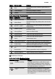 LATVIEŠU Simbols Izvēlnes pozīcija 9 Lietojums Izlase Ietver lietotāja izveidoto sarakstu ar gatavošanas pro‐ grammām. Pamata iestatījumi Ietver pārējo iestatījumu sarakstu. Speciālie Ietver papildu karsēšanas funkciju sarakstu. Apakšizvēlnes funkcijai: Pamata iestatījumi Simbols Apakšizvēlne Apraksts Iestatīt diennakts laiku Iestata pulksteņa laiku. Laika indikācija Aktivizētais displejs rāda pulksteņa laiku, kad ierīce tiek izslēgta.