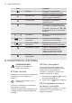 www.electrolux.com 6.2 Преглед на мениата Главно мени Знак Ставка во менито Примена Функции На Греење Содржи листа со функции за греење. Рецепти Содржи листа на автоматски програми. Омилени Содржи листа со омилени програми за готвење направени од корисникот. Чистење Содржи листа на програми за чистење. Основни Поставки Се користи за конфигурација на апаратот. Специјални Содржи листа со дополнителни функции за греење.