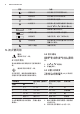 www.electrolux.com 符号/菜单项 描述 符号/菜单项 调节显示屏对比度。 水质硬度 设置水硬度等级 (1 4)。 清洁提示器 提醒您何时需要清洁 本设备。 DEMO 模式 激活/取消激活码: 2468. 维护 显示软件版本和配 置。 显示屏对比度 调节显示屏亮度。 显示屏亮度 设置显示屏语言。 设置语言 调节按键和声响信号 的音量。 蜂鸣器音量 启用和关闭点触区域 的声音。它不能关闭 开关点触区域的声 音。 按键音 描述 出厂设置 将所有设置恢复为出 厂设置。 启用和关闭警报音。 警报/错误声 6.3 下列菜单项的子菜单: 清洁 符号 菜单项 描述 水槽排空 使用蒸汽功能后,用于清除储水盒中的残 留水的程序。 蒸汽清洁增强功能 用于使用烘烤箱清洁剂清洁顽固污垢的程 序。 蒸汽清洁 用于在烘烤箱轻微脏污且未多次烧糊时清 洁烘烤箱的程序。 除垢 用于清理清洗蒸汽发生回路中残留的石灰 石的程序。 漂洗 用于在频繁使用蒸汽功能后冲洗并清洁蒸 汽发生回路的程序。 6.