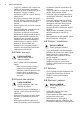 www.electrolux.com • • • • • Çngjyrimi i emalimit ose i inoksit nuk ndikon në funksionimin e pajisjes. Përdorni një tavë të thellë për kek të lëngshëm. Lëngjet e frutave shkaktojnë njolla që mund të jenë të përhershme. Kjo pajisje përdoret vetëm për gatim. Ajo nuk duhet të përdoret për qëllime të tjera, për shembull për ngrohje dhome. Gatuani gjithmonë me derën e furrës të mbyllur. Nëse pajisja është instaluar pas një paneli mobilieje (p.sh.