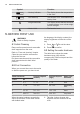 www.electrolux.com Symbol / Menu Application item Contains recommen‐ Assisted Cook‐ ded oven settings for a wide choice of ing dishes. Select a dish and start the cooking process. The temper‐ ature and time are only guidelines for a better result and can be adjusted. They depend on the rec‐ ipes and the quality and quantity of the used ingredients. Submenu for: Basic Settings Symbol / Menu Description item Adjusts the display Display Contrast contrast by degrees.
