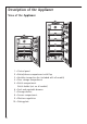 Description of the Appliance View of the Appliance 1 = Control panel 2 = Butter/cheese compartment with flap 3 = Variable storage box (not included with all models) 4 = Door storage compartment 5 = Bottle compartment Bottle holder (not on all models) 6 = Fruit and vegetable drawers 7 = Storage shelves 8 = Freezer compartment 9 = Moisture regulation 10 = Rating plate 10