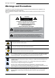 Warnings and Precautions Warnings and Precautions To prevent any injuries, the following safety precautions should be observed in the installation, use, servicing and maintenance of this equipment. Before operating this equipment, please read this manual completely, and keep it nearby for future reference. CAUTION RISK OF ELECTRIC SHOCK DO NOT OPEN TO REDUCE THE RISK OF ELECTRIC SHOCK DO NOT REMOVE COVER (OR BACK) NO USER-SERVICEABLE PARTS INSIDE. REFER SERVICING TO QUALIFIED SERVICE PERSONNEL.