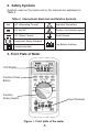 2. Safety Symbols Symbols used on the meter and in this manual are explained in Table 2. Table 2. International Electrical and Relative Symbols ~ ~ AC (Alternating Current) Important Information ! DC and AC Caution, risk of electric shock DC (Direct Current) Earth Ground Equipment Safety Standard + Double Insulated Low Battery Indicator 3. Front Plate of Meter LCD Display Function Press Button Function Rotary Switch Input Terminal Figure 1.