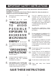 IMPORTANT SAFETY INSTRUCTIONS When using electrical appliances, basic safety precautions should be followed, including the following: WARNING - To reduce the risk of burns. Electric shock, fire, injury to persons, or exposure to excessive microwave energy: 1 Read all instructions before using this appliance. 2 Read 3 and follow the 6 specific "PRECAUTIONS TO AV O I D POSSIBLE 7 EXPOSURE TO EXCESSIVE 8 M I C R O W AV E ENERGY" found on page 1. 9 This appliance must be grounded.