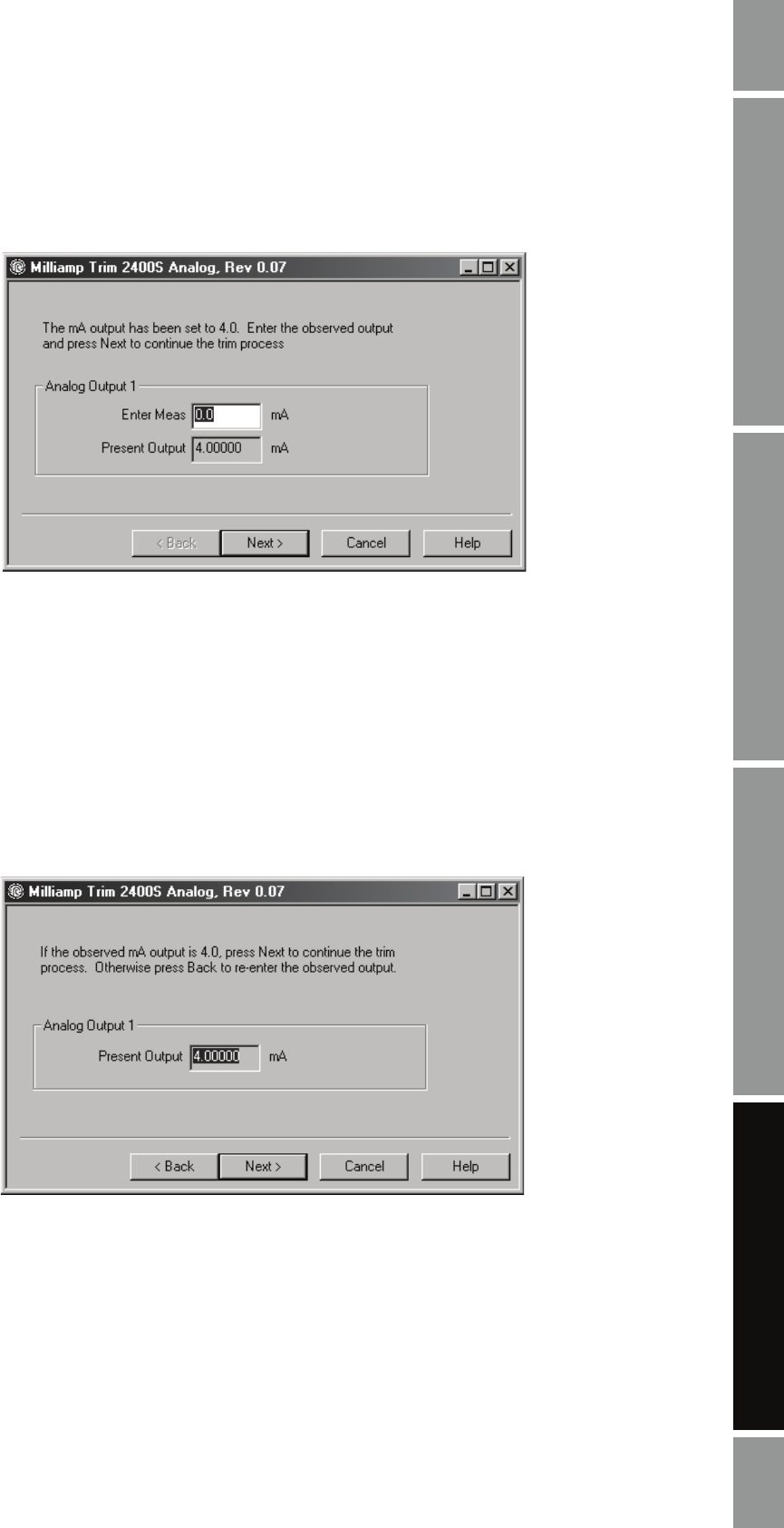Next. At this point, the transmitter trims the milliamp output and displays the adjusted
