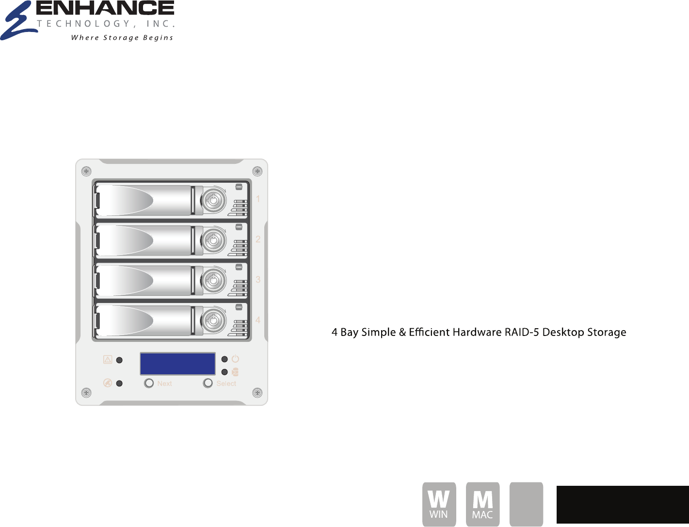 E400 FR 1 Quick start guide Welcome 4 Thank you for choosing Enhance Technology Understanding your E400 FR Learn and identify each component of E400 FR ! Thank you for buying!Enhance Tecenology E400 Series, A 4-bay desktop RAID-5 solution for professionals who demand exceptional data protection. Featuring up to 8TB of capacity, cable-less backplane and universal connectivity, including FW400/800, eSATA and USB for PC and Mac.