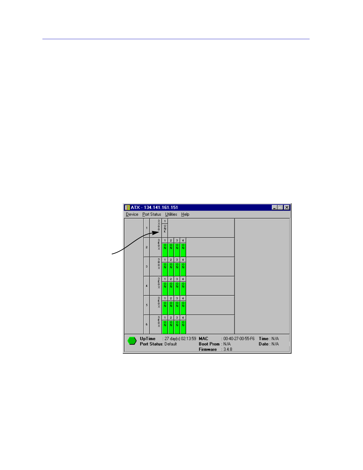 The ATX Switch Chassis View window (Figure 2-2) provides a graphic