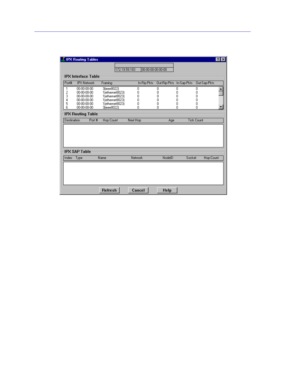 The window consists of three separate tables: IPX Interface, IPX Route, and IPX