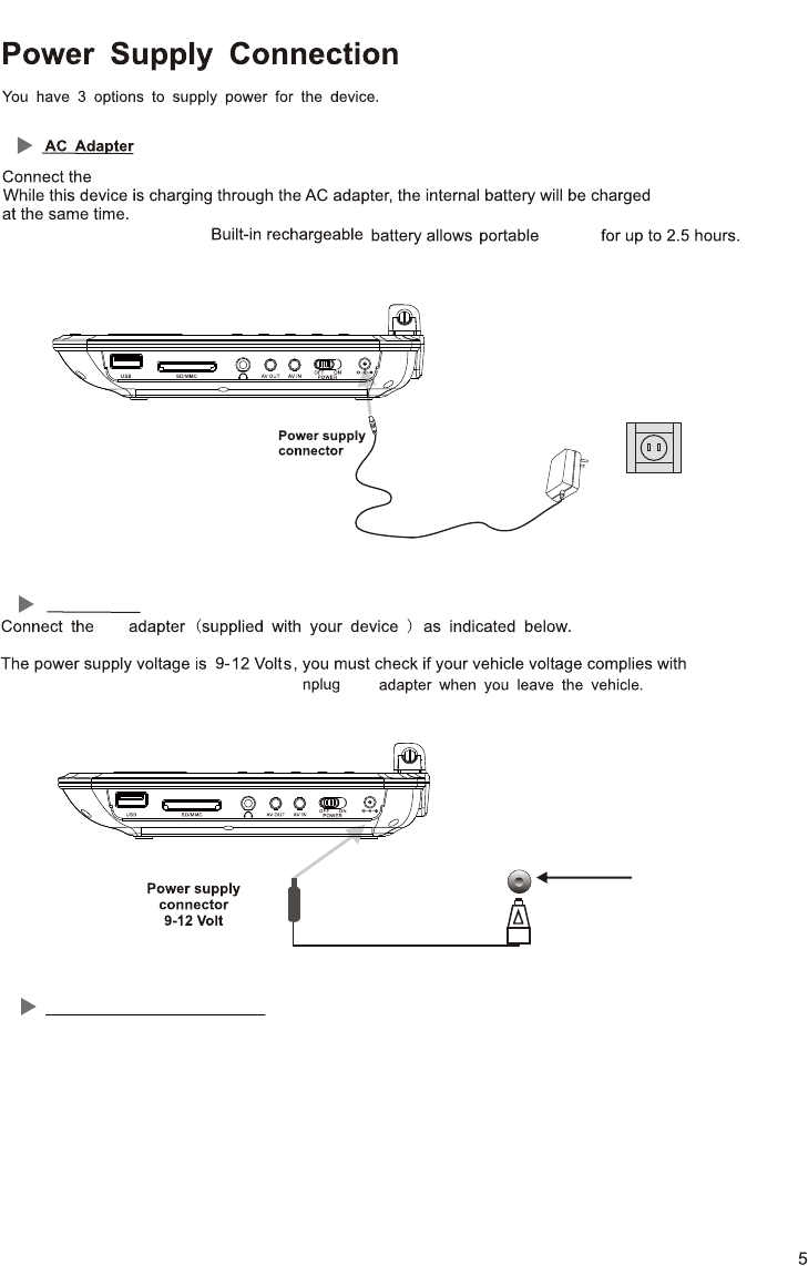 supplied 9-12 volts AC adapter to the player and to the power outlet.
